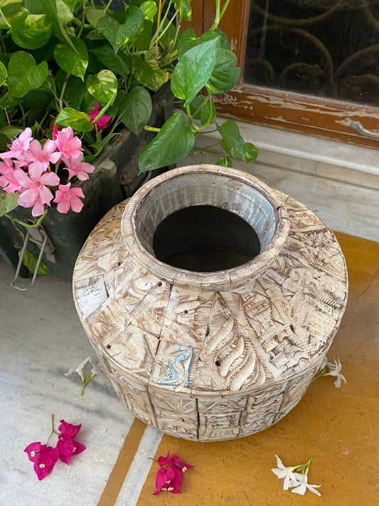 Tanjore Artisan Carved Wooden Vase-Anticoarte